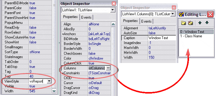 Tak więc, bez zbędnego zagłębiania się w szczegóły, tworzymy nowy projekt i umieszczamy na formularzu dwa obiekty typu TlistView i TButton. Właściwość ViewStyle obiektu ListView1 zmieniamy na vsReport, a we właściwości Columns tworzymy dwie kolumny o nazwach 'Tekst