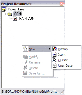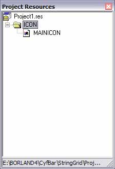 Jak widać na rysunku w takim pliku znajdują się nazwa projektu, w tym przypadku jest to Project1, oraz ikona aplikacji. Domyślna ikona aplikacji zawsze nosi nazwę MAINICON. Oprócz tych standardowych zasobów, korzystając z tego okna można włączyć do projektu takie zasoby jak bitmapy, ikony, kursory statyczne oraz dane użytkownika.