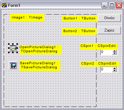 W celu skonwertowania formatu JPG do BMP posłużymy się metodą 'Canvas->Draw'. Tworzymy nowy projekt i umieszczamy na formularzu pięć komponentów: 'Image1', 'Button1', 'Button2', 'OpenDialog1' i 'SaveDialog1'. Przechodzimy do komponentu 'Image1' i ustawiamy jego właściwość 'AutoSize' na true, potem do komponentu 'OpenDialog1' i w jego właściwośći 'DefaultExt' wpisujemy: jpg. Podobnie postępujemy z komponentem 'SaveDialog1' wpisując w jego właściwości 'DefaultExt': bmp.