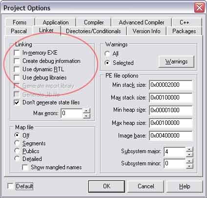 Potem przechodzimy na zakładkę Linker i odznaczamy opcje: Use dynamic RTL i Use debug libraries
